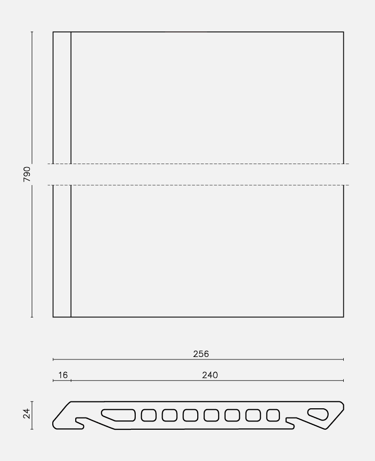 Ceramic piece. Most of the facades are resolved through a ventilated facade system, with an outer sheet formed by ceramic plates 80 x 24 x 2,4 cm, mechanically fixed to guide anodized aluminum profiles 36 mm thick. Different profiles would racks screwed to galvanized tube 50 mm welded to the anchor plates that would be arranged horizontally around the perimeter of the building. After the outer sheet formed by the ceramic plates, between the galvanized metal racks anchored to the structure, the thermal insulation consists of extruded polystyrene plates 50 mm thick is placed.