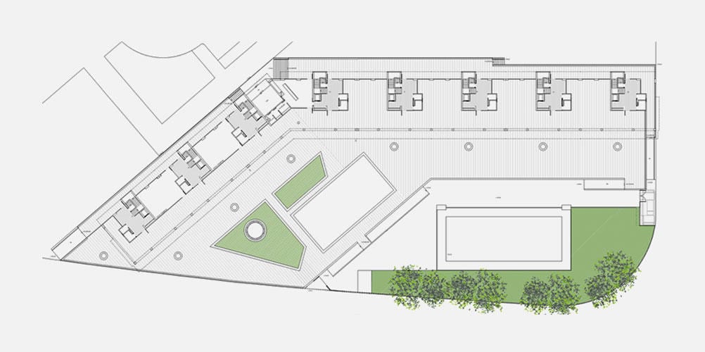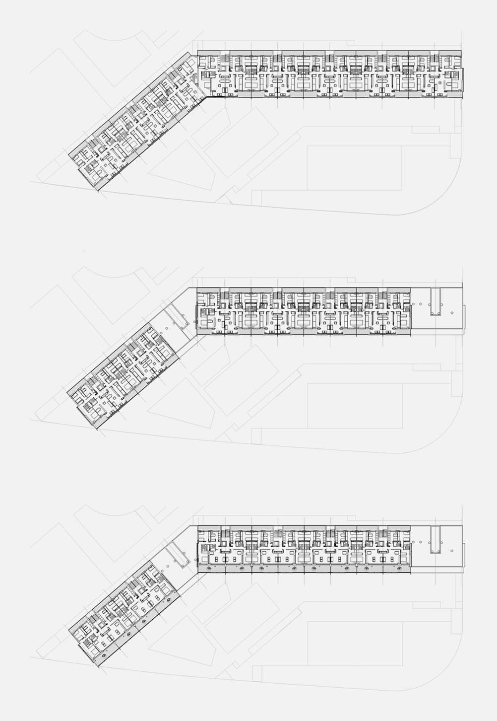 The starting point has been to make a general shape nine floors high that emphasizes the ensemble’s horizontality, according to the crossroad in which the building is constructed. Within this shape a work on the silhouette has been done making two cuts in the last four floors both in the vertex of the plan and in the east end. The central cut articulates the joining between the wings while the east end’s lower height allows for a graduating of the relationship with the street and the neighbour Health Centre. The shaping of the building comes from the relationship between the overall layout and the constructive system that defines the encircling made up of walls clad with long grey metallic ceramics panels that define a background on which longitudinal cantilever slabs have been made, provided with sliding aluminium louvres panels that make up double façades, behind which glass rails have been placed.