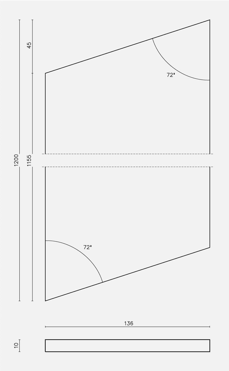 Ceramic piece. The ceramic material used in the design of the Plaza Mayor in Villarreal was technical porcelain stoneware, 1200 x 600 x 10 mm in size. These were then cut into pieces 1200 x 200 x 10 mm in size, forming an angle of 68º with the smallest side of the piece, using a numerically controlled cutting system and rectifying the edges. Three types of enamel, matt, semi-matt and gloss were used to produce a differential vibration effect with light. These ceramic pieces were fixed mechanically and chemically to aluminium T profiles screwed on the steel battens on the structure of the awning.
