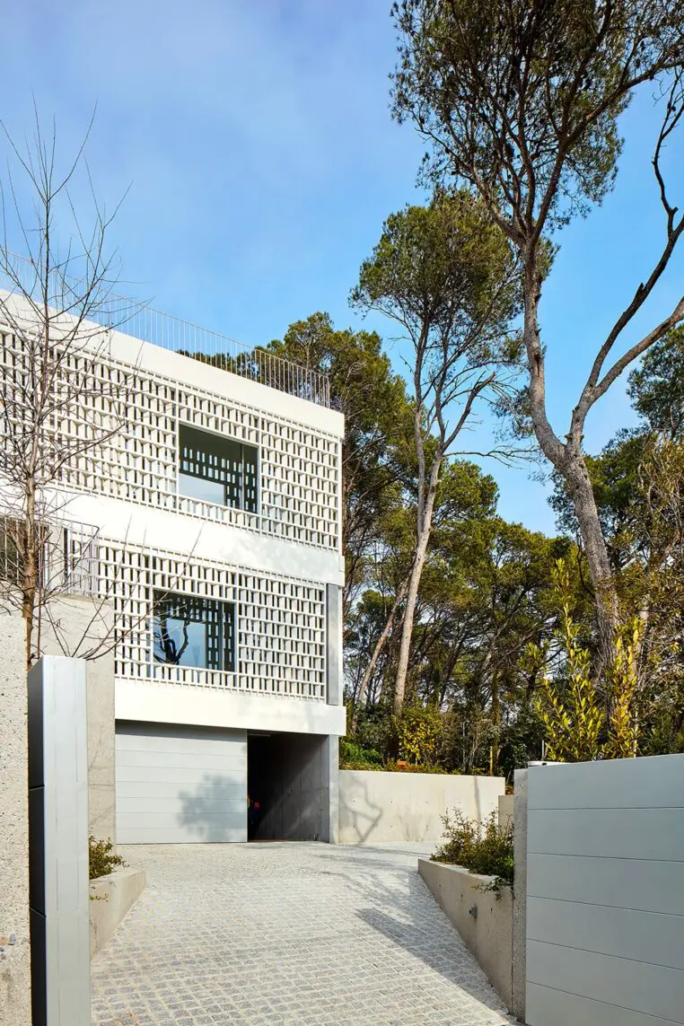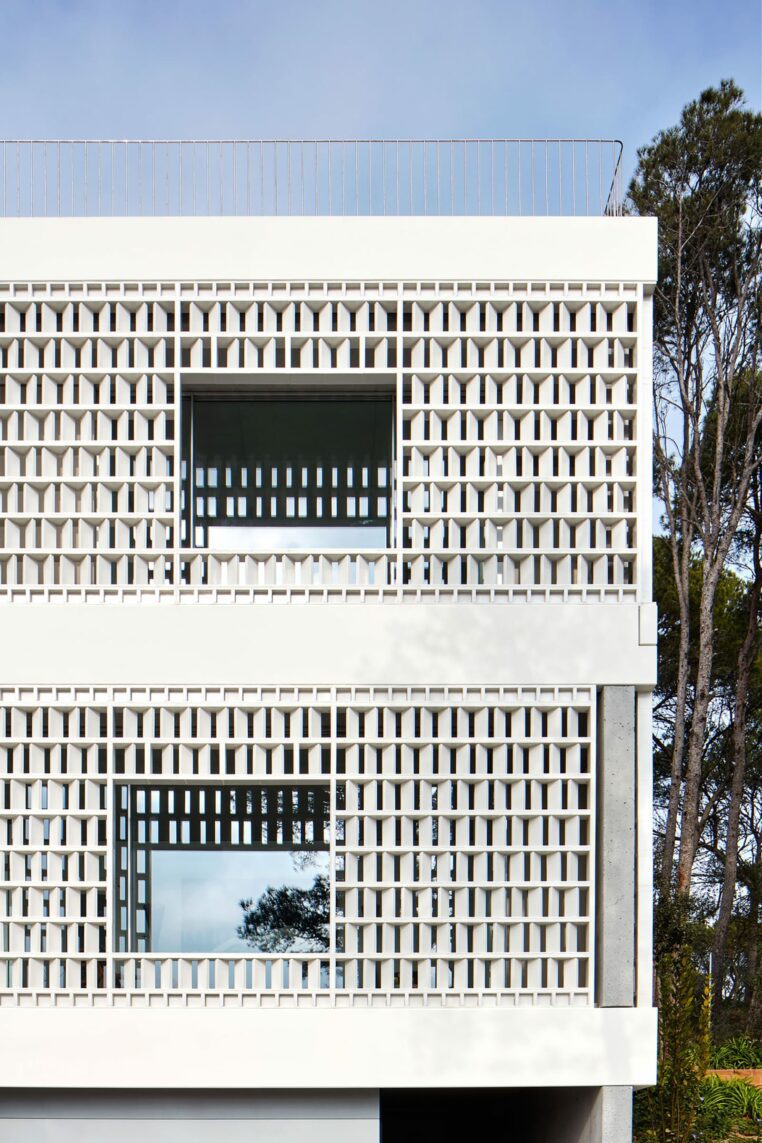 Esta se interrumpe de vez en cuando para enmarcar las vistas del mar y del puerto en la distancia. Dos componentes de hormigón blanco prefabricado proporcionan un marco para la celosía: el componente superior corona el techo verde del edificio y el inferior esconde persianas que permiten cerrar la casa con total seguridad. El conjunto está delicadamente posicionado sobre la estructura portante del edificio de hormigón arenado en obra.