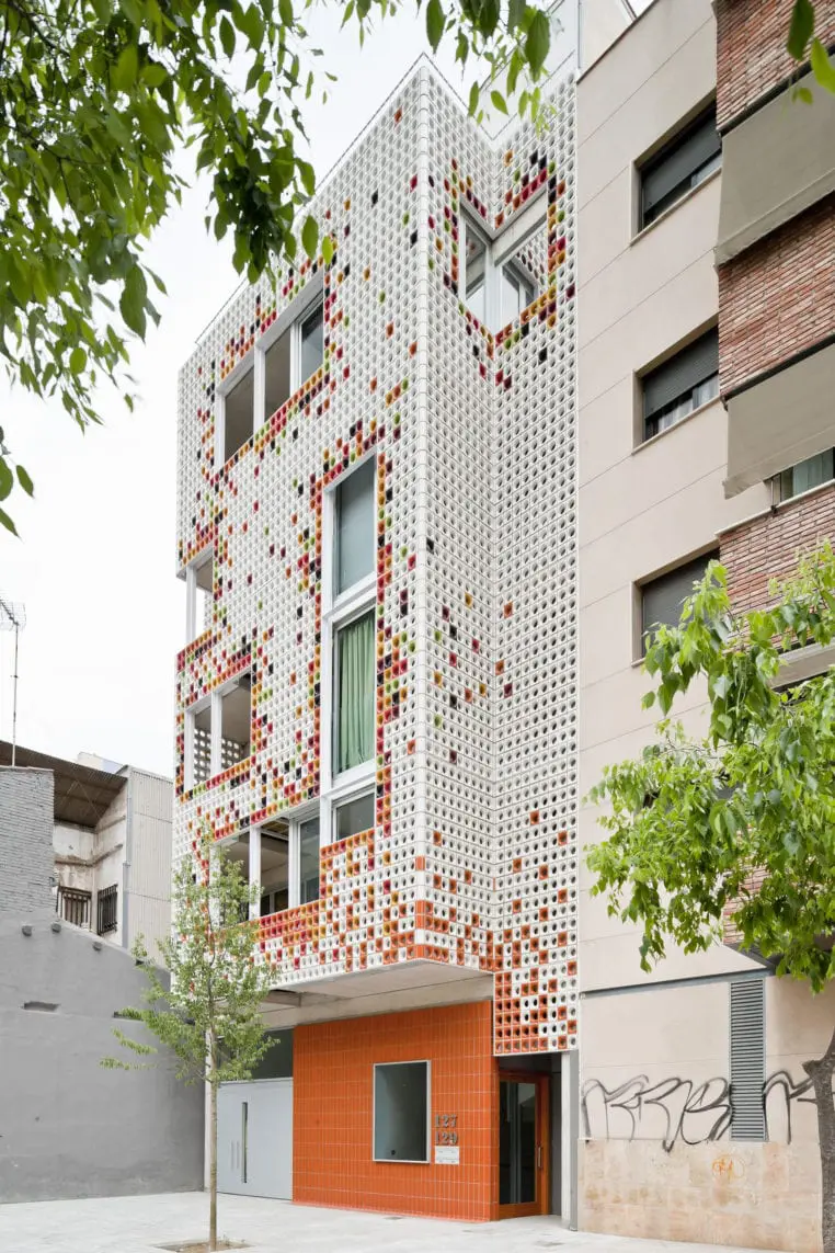 La fachada a la calle es más alegre, más acorde a la relación con la ciudad y con la tradición modernista de la zona. En planta baja nos encontramos con un zócalo de cerámica color naranja prolongada en las plantas superiores mediante una gran celosía cerámica que protege del sol de oeste y privatiza las estancias de la visión exterior.