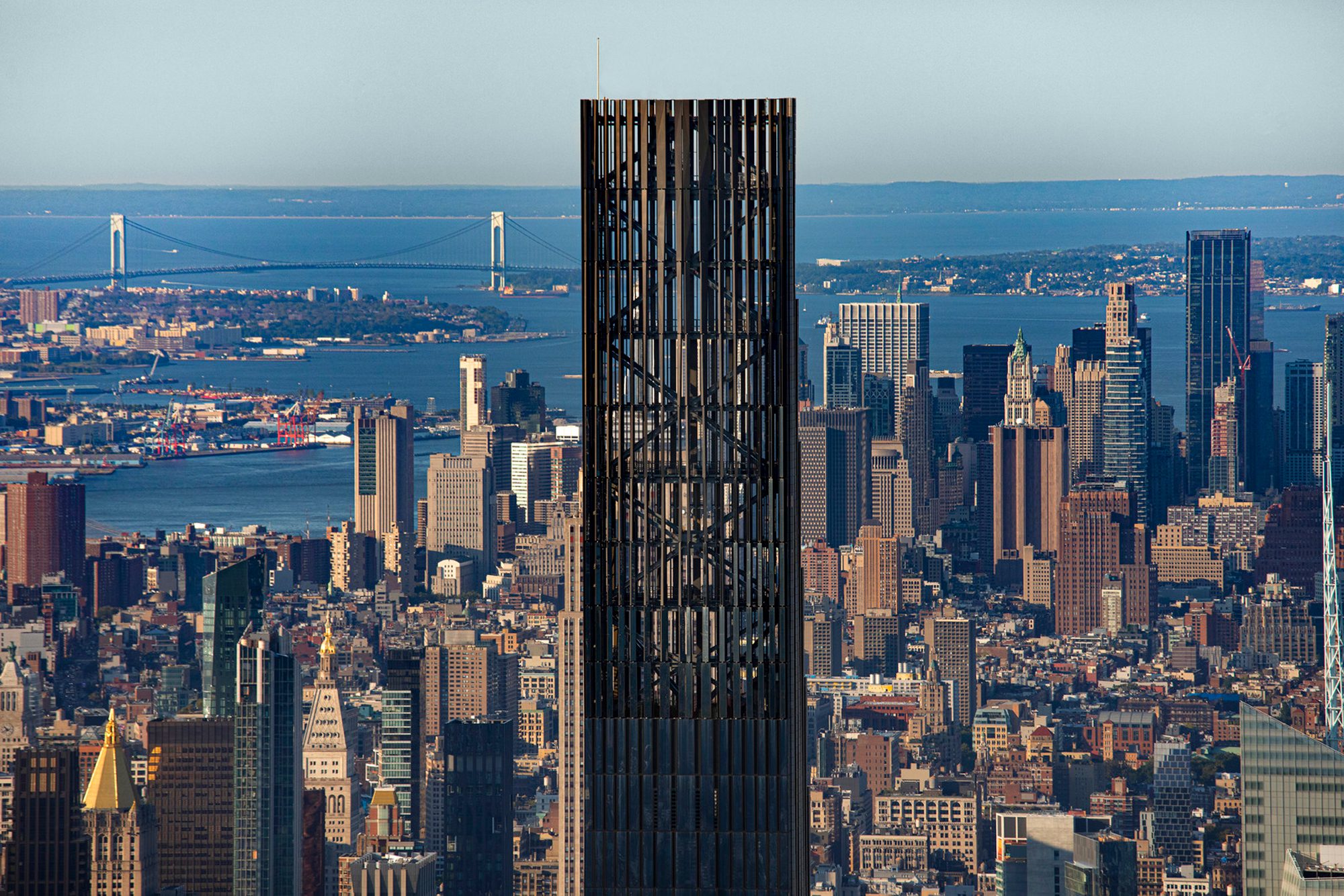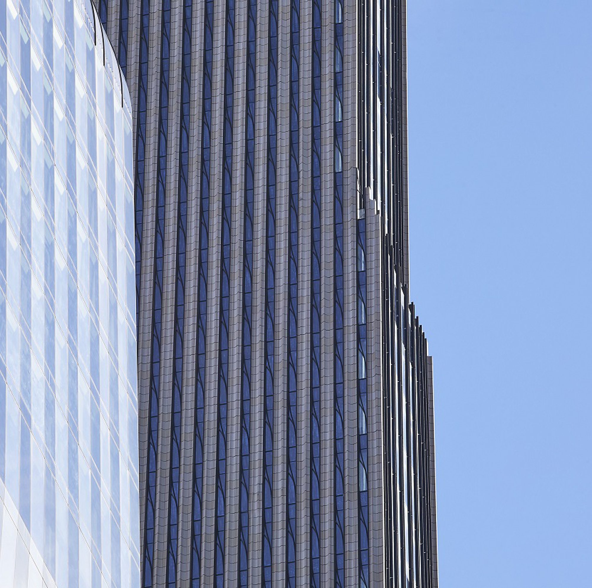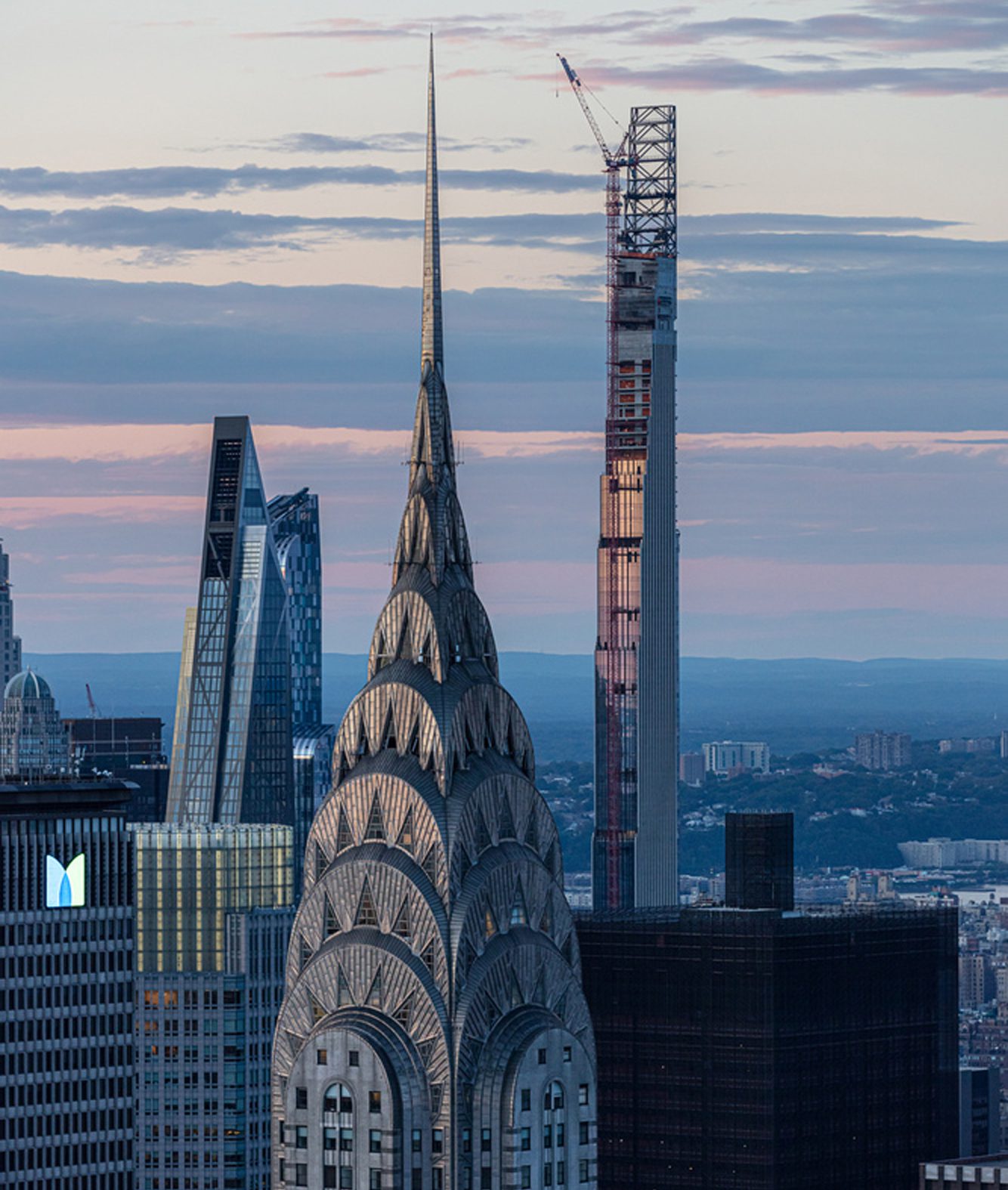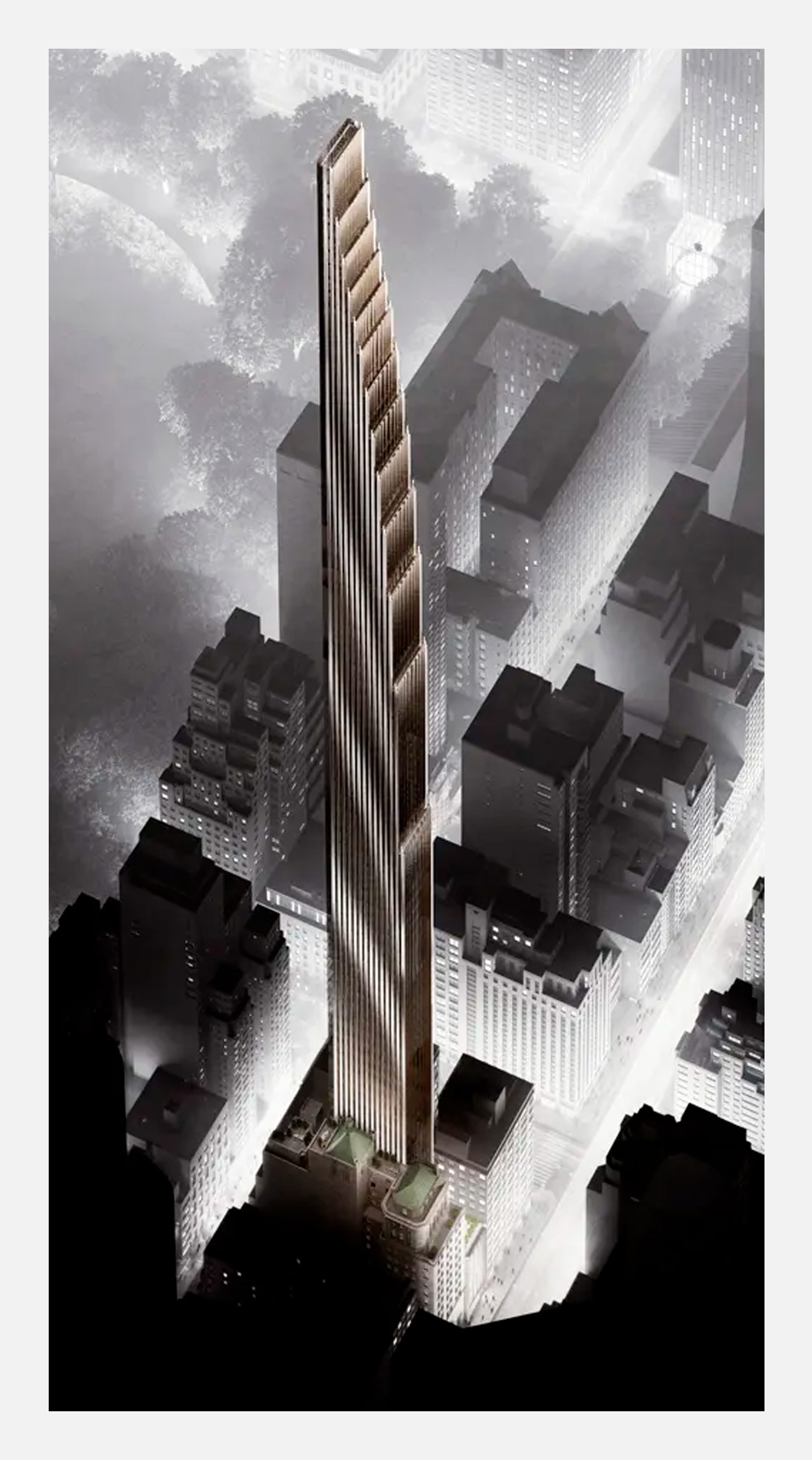 The architectural expression is defined by the use of terra-cotta cladding that rises along the east and west façades, visually unifying the tower’s massing in the tradition of classic New York skyscrapers such as One Wall Street, 30 Rockefeller Center, and the Empire State Building. A decorative crown measuring 91 meters in height completes the composition and reinforces its classical references.