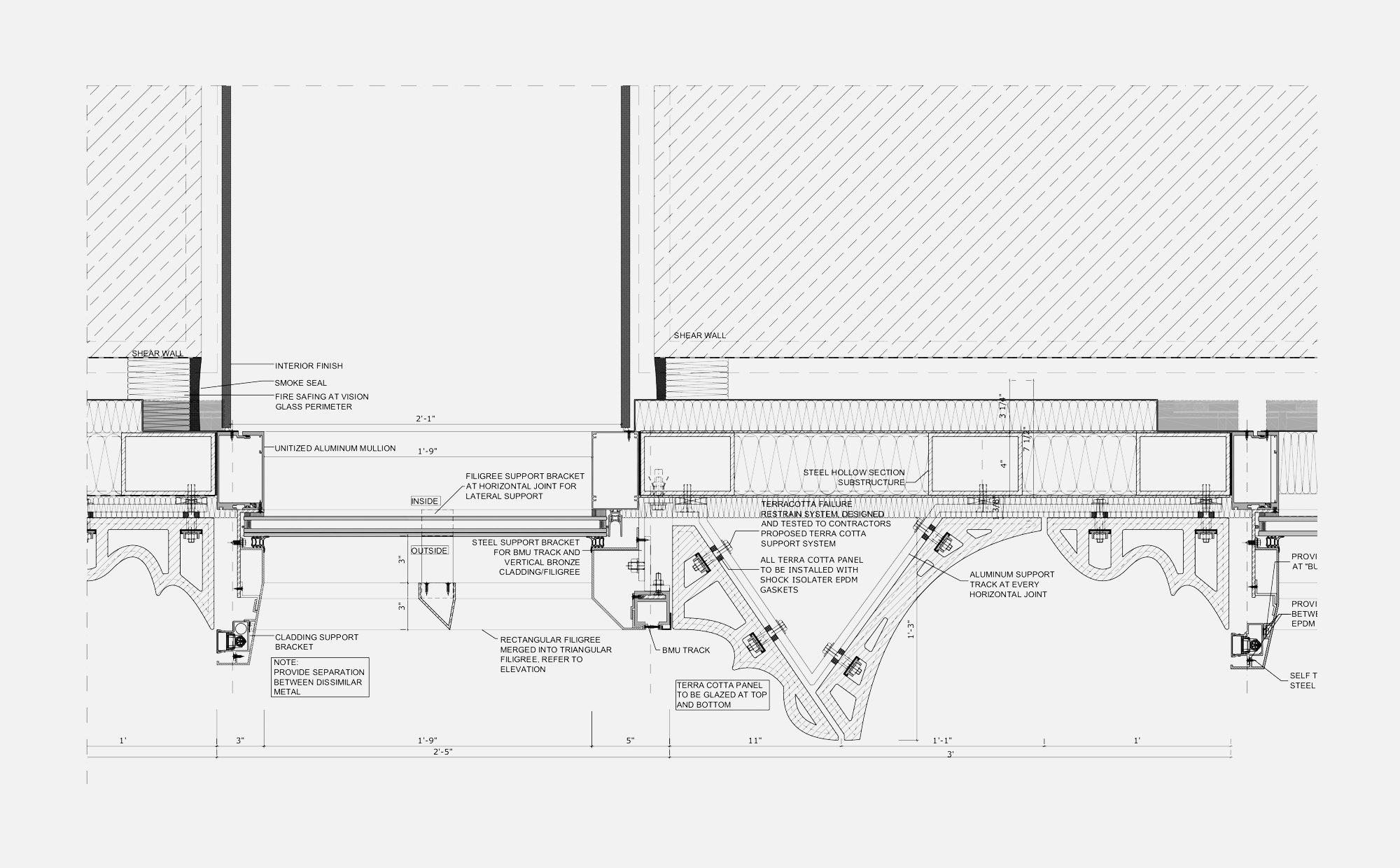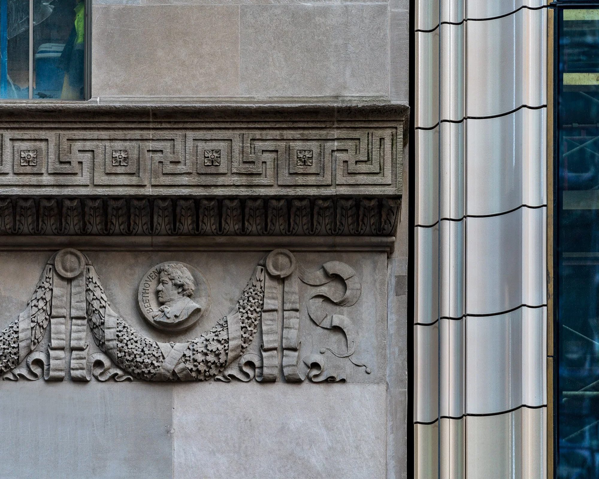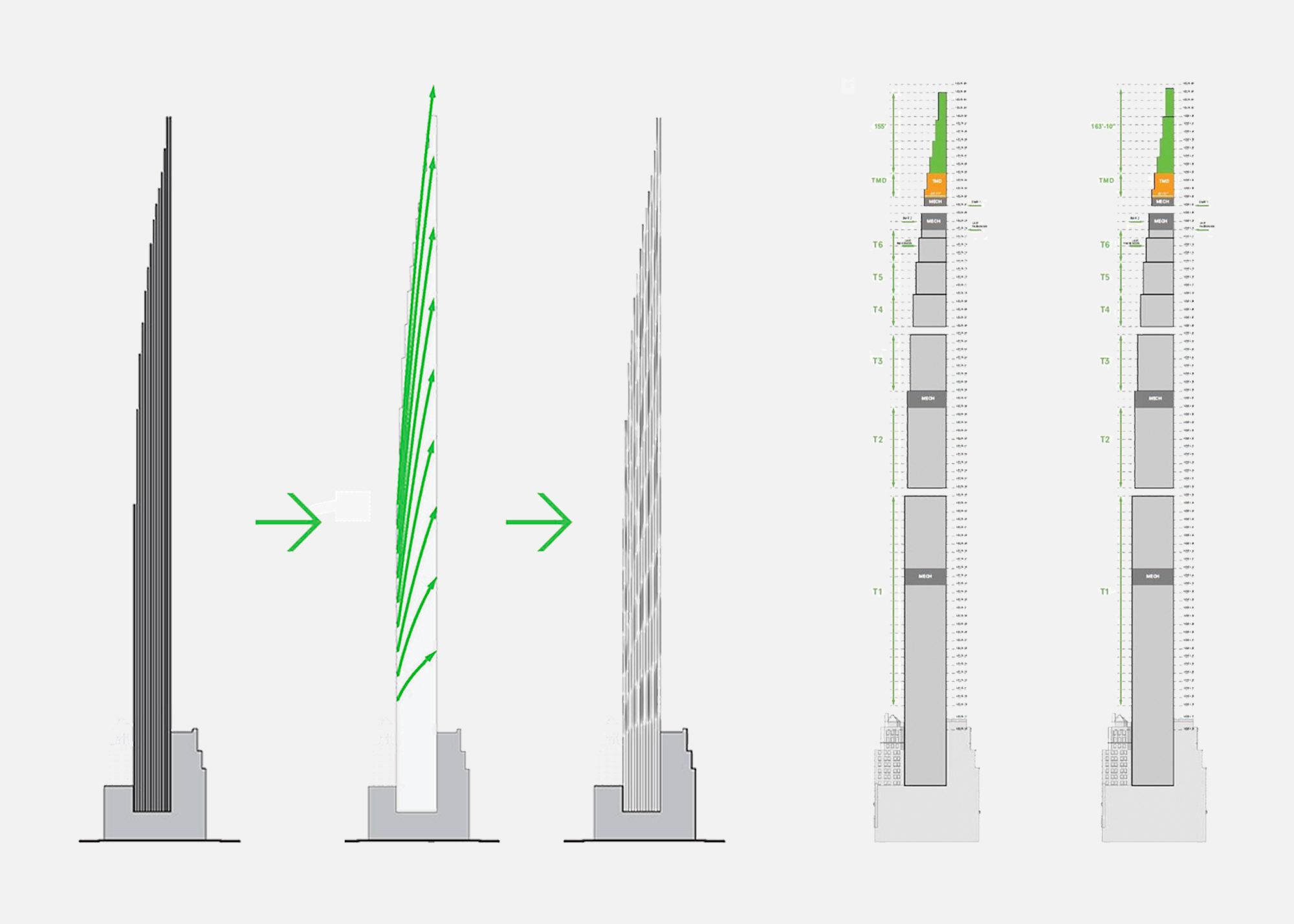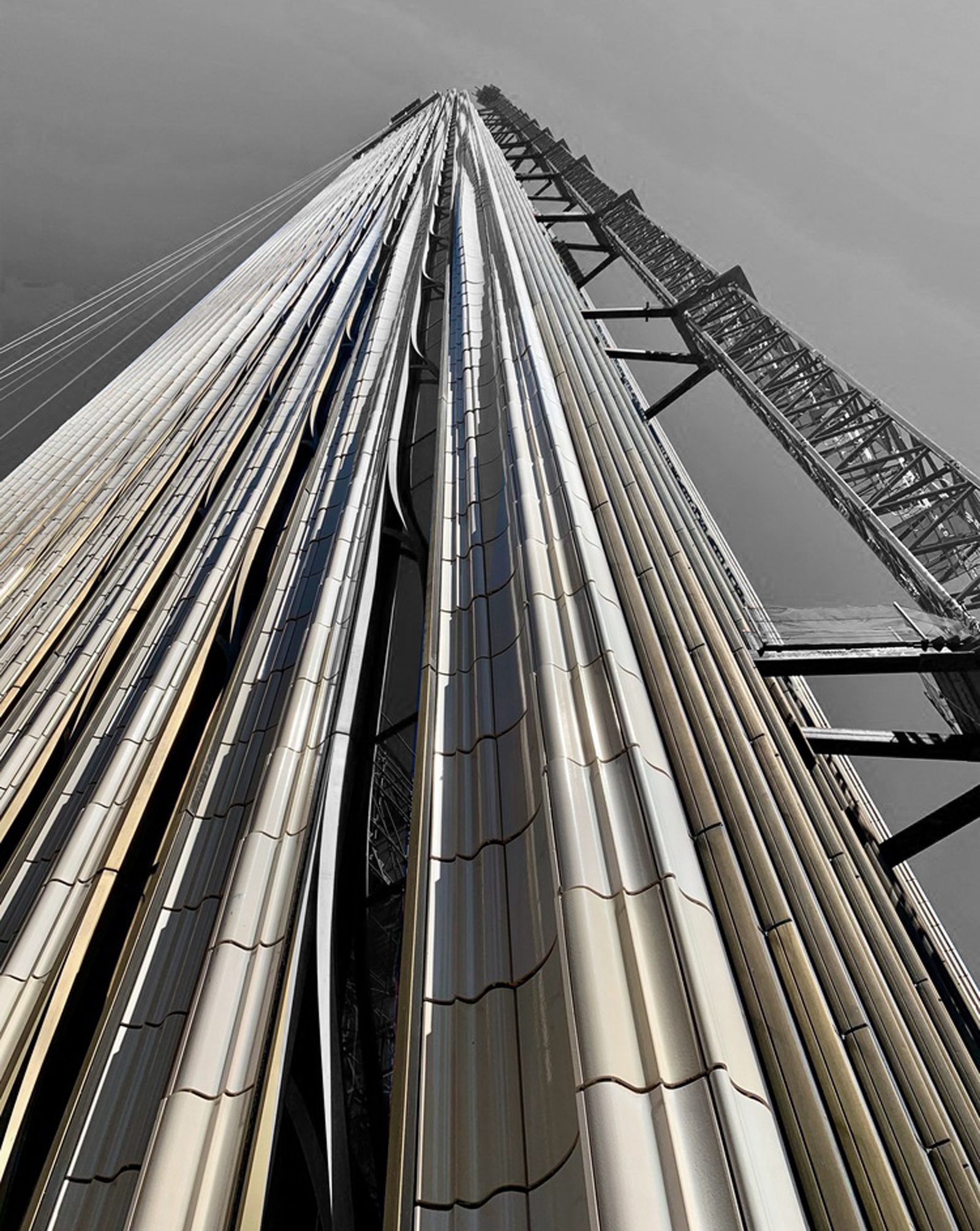 The architectural expression is defined by the use of terra-cotta cladding that rises along the east and west façades, visually unifying the tower’s massing in the tradition of classic New York skyscrapers such as One Wall Street, 30 Rockefeller Center, and the Empire State Building. A decorative crown measuring 91 meters in height completes the composition and reinforces its classical references.