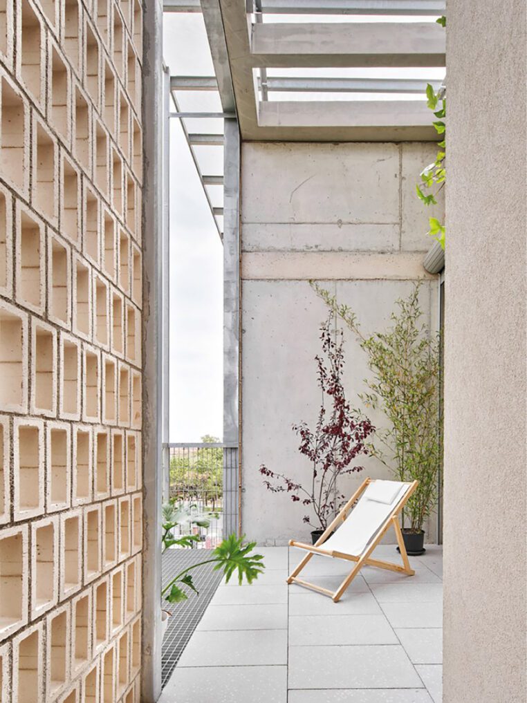 The cantilevered metal balcony system incorporates roller shutters and acts as a vegetation support. On the first floor, the terraces facing the park are interspersed with the ventilation courtyards of the parking lot, generating a thickness as a filter of privacy between the public space and the house. The enclosure of the courtyards facing the street is split to create another air inlet that allows cross ventilation in the parking lot. The use of the exposed brickwork, as a materiality determined by the planning, is an opportunity to introduce lattices that give a porous texture to the facade of the building.