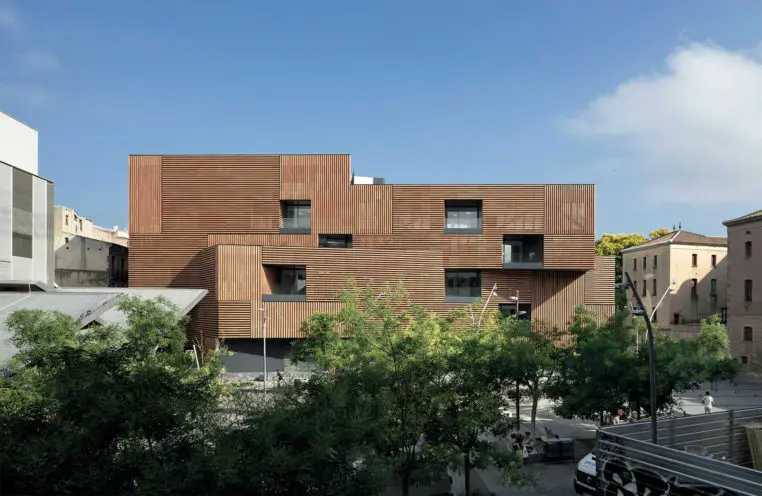 In contrast to the residential building that seeks to be diluted in the context, in the Massana school building we seek singularity. If in the houses we wanted a domestic scale, in the school we work with a larger and more abstract scale. However, in order to prevent the school from capitalising the entire square, we placed the main entrance in front of the future connection with the courtyard of the Library of Catalonia and created a new public space between Plaça de la Gardunya and Plaça del Canonge Colom. The result is a dynamic building whose main façade avoids the frontality with respect to Plaza de la Gardunya.