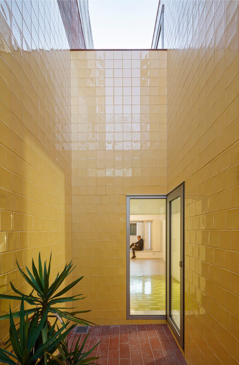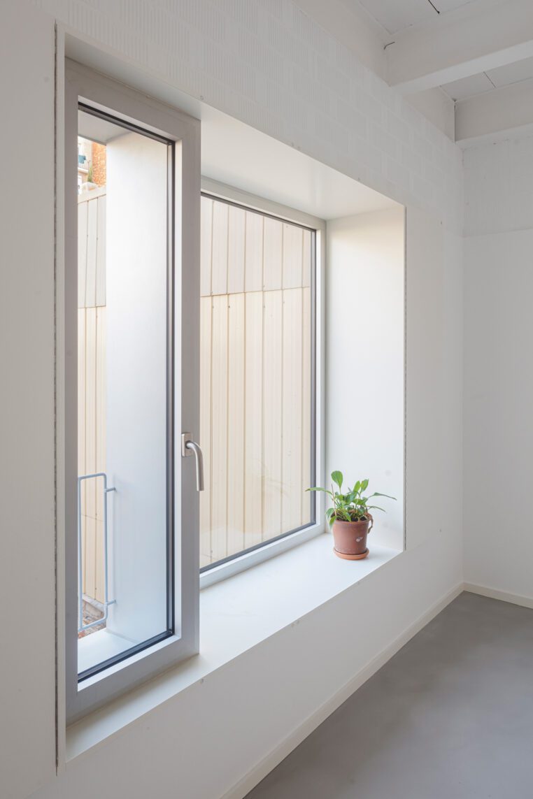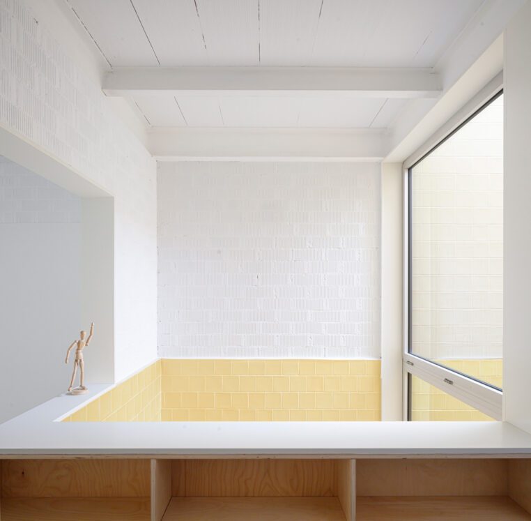 A house between party walls, extremely narrow (3.60m) and elongated, in the Sants neighborhood of Barcelona. Due to its depth, a central courtyard and a double space open up to bring natural light into the ground floor. Due to the constraints, the staircase is placed longitudinally, in the centre, connecting levels at mid-height, avoiding corridors. The ground floor therefore has two different interior heights. On the rear side, a height of one and a half levels, opening onto the garden. The spaces are organised in series, connected by the structural frames. The entrance to the house is through a garage, and then an entrance threshold. This leads to the kitchen, placed in the center, open to the staircase. At the rear is the high ceiling living room, and the garden behind the building. On the first floor the distribution is symmetrical, made up of two connected rooms on each side, bedrooms on the façade and a play or work space, associated with a small bathroom, as an anteroom. The roof terrace serves as an extension of the house, an interior but uncovered space enclosed by high walls. A platform rises slightly at the back to overlook the rear garden. The relationship with the outside is open on the ground floor and, on the first floor, framed by two large, deep windows. They are the protagonists of the bedrooms. These two nest windows are divided into two offset parts. One is narrow and in line with the internal plane, to be opened for ventilation and to access a small balcony in the thickness of the façade. The wider one, with fixed glass alligned with the exterior, serves as a window seat to observe the outside. Materiality is simple. Walls and roofs are made of faced ceramics. Walls are plastered in the lower parts, and all is painted white. The pavements are mainly micro-cement, with some of the rooms being surfaced with two-colored mosaic tiles (whole piece and ¼ cut piece). The façade facing the street and the inner courtyard façades are tiled with glazed tiles. Also the bathrooms. From the courtyard, the tiling continues into the interior of the house, going down to the kitchen through the double space, conducting and reflecting the sunlight.