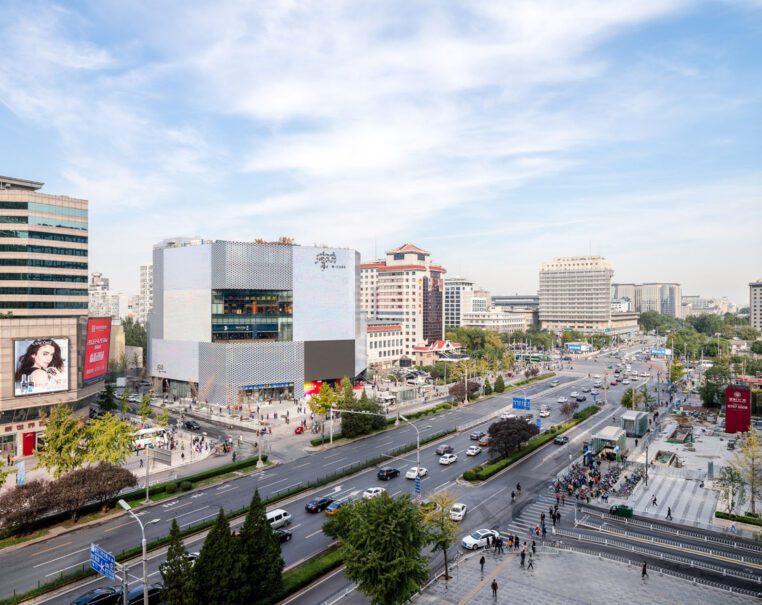 MVRDV was commissioned to design the building’s exterior and responded to these competing hopes with a 7-storey volume that rises to the maximum allowed height of 36 metres—an unusually tall building for this kind of mall. The shape of the building was generated by cutting the volume at various angles to orient the façades to face key locations, such as the railway station and an intersection on the other side of the street, generating a shape that is both contextual and recognizable in its visual presence. It also allowed MVRDV to include open-air terraces on each level, which are symbolically oriented towards landmarks such as the Forbidden City and Temple of Heaven—some visible from the building, others more distant—to root the building in its location.