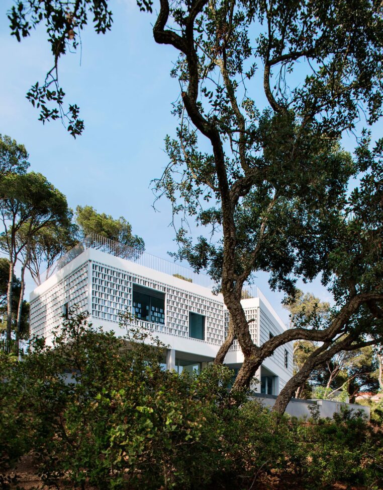 The lattice, which in interrupted now and then in order to frame the views of the sea and the port in the distance. Two components of prefabricated white concrete provide a frame for the latticework: the upper component crowns the green roof of the building and the lower one conceals rolling shutters that enable the house to be shut up with complete security. The ensemble is delicately poised on the building’s load-bearing structure of sandblasted in situ concrete.