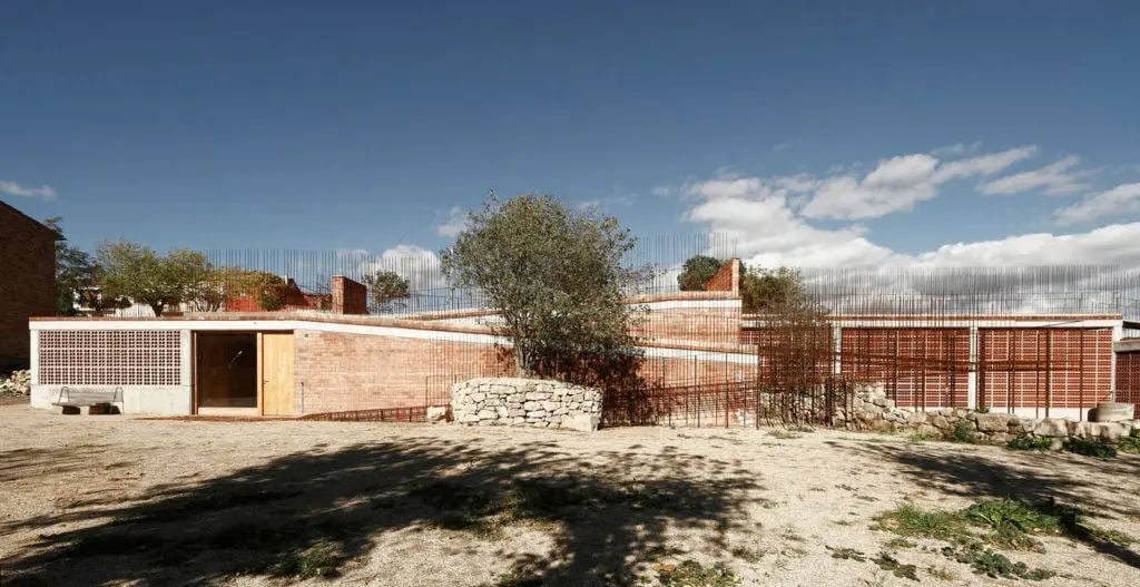 A succession of mild ramps with light and elastic limits made of corrugated steel suggest the transits and cover the different conditions of the projected public space: …a clay and humus platform between the square and the prepirinenc horizon, a cliff above the chamber of the steles from which we can localize the area of the discovery…, a corner space looking to west with sunlight in the winter and vegetal cover during the summer, some benches made of recycled stones from one of the walls of the orchards, porous pavings which offer thermal inertia to the roof and embrace the landscape adapting to the different seasons…, the shadows of two recovered warehouses… and the memory of the previous orchards with the spontaneous regrowth of chard.